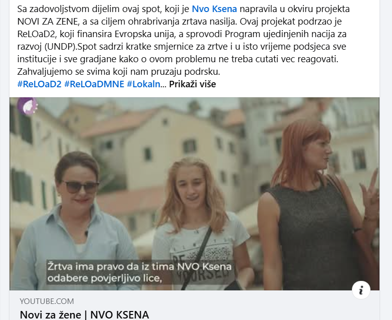 NVO,,KSENA” djeluje od 2019. godine i pruža kontinuiranu podršku ženama i djeci žrtvama porodičnog i rodno zasnovanog nasilja u opštinama Herceg Novi, Kotor, Tivat i Budva. Poseban fokus je na ranjivim grupama, uključujući žene u invalidskim kolicima, koje se suočavaju sa fizičkim, institucionalnim i društvenim preprekama.